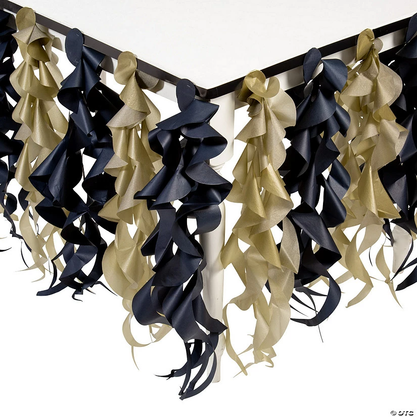 The right table skirt can add to the overall look of a celebration while creating storage space underneath the table without being unsightly. This unusual table skirt features black and gold swirls and looks great at a graduation party, birthday party or any other black and gold themed gathering. Add depth and variety to black and gold party decorations with this attractive table skirt. Paper. 9 ft. Simple assembly required. © OTC