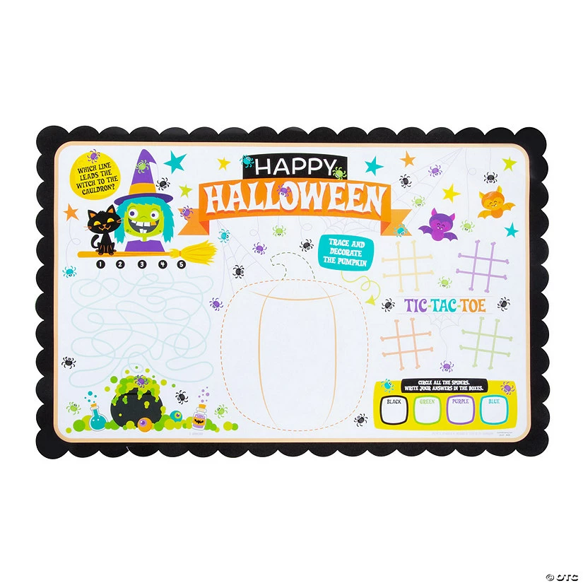 Give the kids a Halloween thrill they will love (almost) as much as their trick-or-treat loot! These Halloween party-ready placemats are loaded with fun and include a variety of games and activities such as a word search puzzle and tic-tac-toe. Set one at every seat during a Halloween costume event in the classroom, daycare or at home. Paper. 17β x 11β Β© OTC