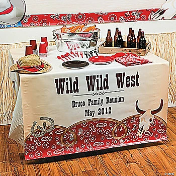 Personalized Red Bandana Table Runner. Your western party is about to get wild! Your guests will instantly recognize your time and effort when they see this Personalized Red Bandana Table Runner. Make it something extra special with your event’s name and date! Personalize with 3 lines: 20 characters/spaces on the 1st and 28 characters/spaces on the 2nd and 3rd lines. Vinyl. 50″ x 6 ft. Β© OTC