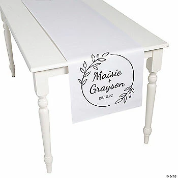 Add some style to your wedding reception supplies with this attractive table runner featuring a lovely design and personalized text. Personalize a wedding reception to impress guests and help the happy couple feel even more special with this table runner. Great for a food table, sweethearts table or for a gift table, this table runner helps elevate the look of a reception. Vinyl. 17″ x 72″ Personalize with 3 lines of text. Β© OTC