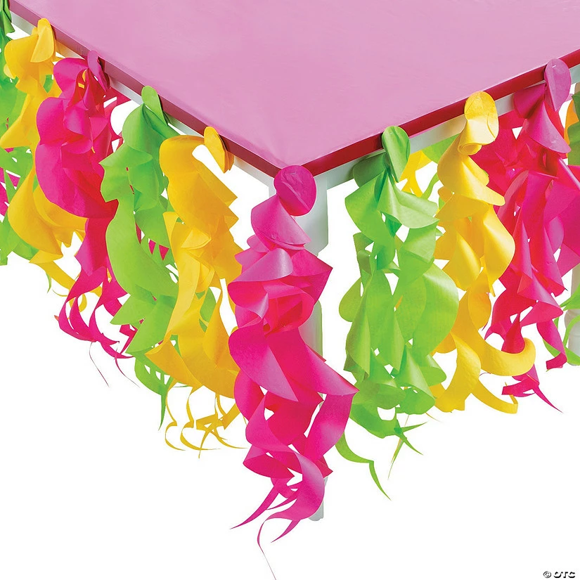 Let the look of the tropics swirl all about with this fun party decoration! This luau decoration will give a reception table, gifts table, bar or other edge a lu-wow look. Add this table decoration to your luau supplies and find many, many more luau party supplies elsewhere on this site. Tissue paper. 9 ft. x 26″ Simple assembly required.